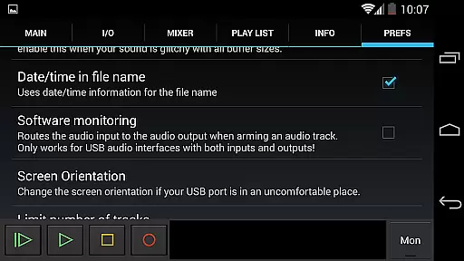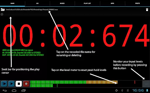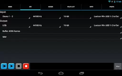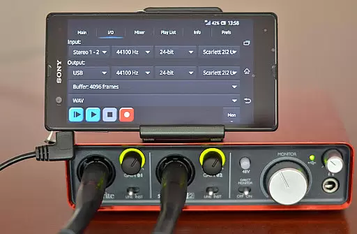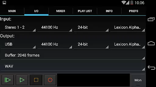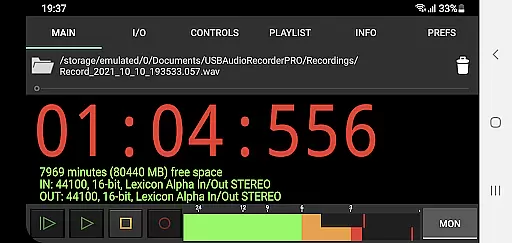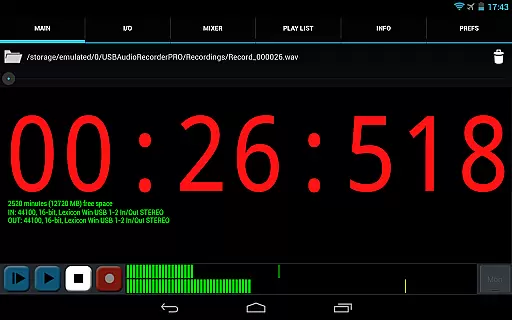One of the app's notable strengths is its ability to provide precise control over audio settings. Users can monitor input levels with peak hold functionality, select specific inputs and outputs, and adjust internal controls like gain and volume directly from the mixer screen. Additionally, the app allows playback through Android's internal speakers, which is particularly useful when using input-only devices like USB microphones. These capabilities make USB Audio Recorder PRO a powerful tool for achieving professional-grade audio recordings on mobile devices.