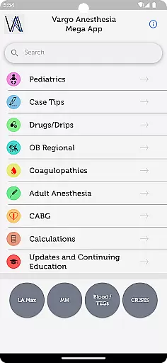 Vargo Anesthesia Mega App is an all-in-one medical resource, combining 17 distinct anesthesia-related applications into a single platform. This comprehensive app provides quick access to essential information for anesthesiologists and certified registered nurse anesthetists (CRNAs). It includes tools like 'Malignant Hyperthermia', 'Anesthesia Case Tips', 'Crises', and more, each designed to simplify complex procedures and protocols.