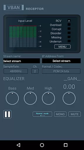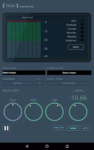 VBAN Receptor offers an array of sophisticated features tailored for both casual listeners and audio professionals. The app supports Play/Stop streaming functionality, Mono/Mute options, and a Mix Down Mode for enjoying surround sound streams like 5.1 or 7.1 channels.