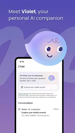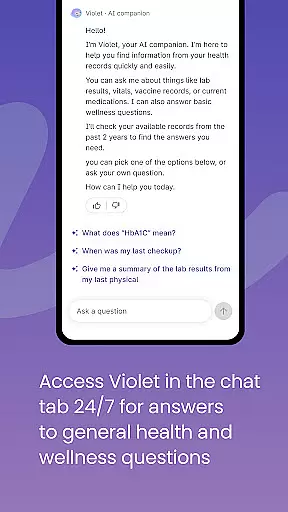 Furthermore, users can engage with Violet, their AI companion, to inquire about wellness topics or understand their health records better. This feature combines artificial intelligence with expert-reviewed content, ensuring accurate and helpful responses to user queries.