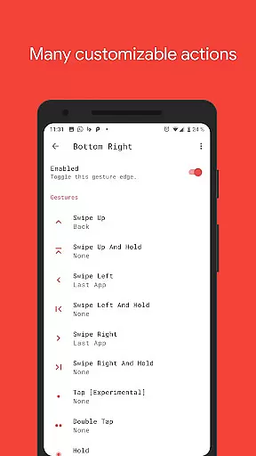 The app supports multiple gesture triggers from various points on the screen, such as bottom left, bottom center, and more, ensuring that users can interact with their device in a way that feels natural and comfortable. With available gestures like swipe up, swipe left, double tap, and hold, users are provided with a comprehensive set of controls that cater to different preferences and usage styles.