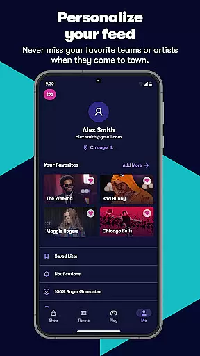 Personalization is at the core of Vivid Seats' functionality. Users can quickly access recently viewed events and receive notifications about favorite performers coming to their area. The Music Scan feature simplifies this by syncing with Spotify to populate a personalized favorites list automatically.