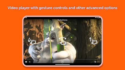 The application boasts advanced features like multi-track audio and subtitle support, auto-rotation, aspect-ratio adjustments, and gesture controls for volume and brightness. A media library function allows easy browsing and management of audio and video files.