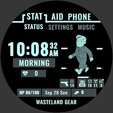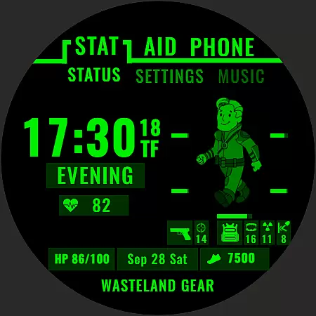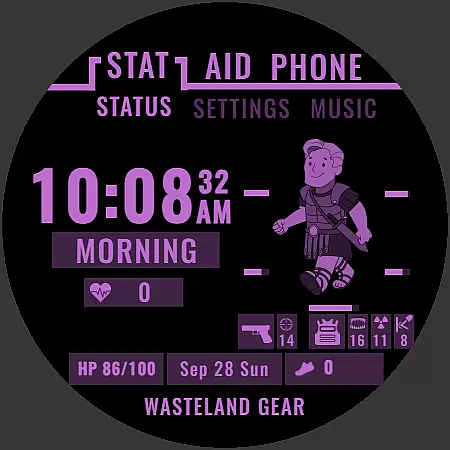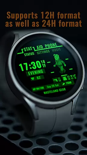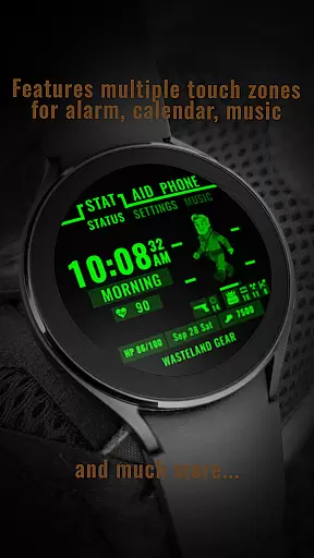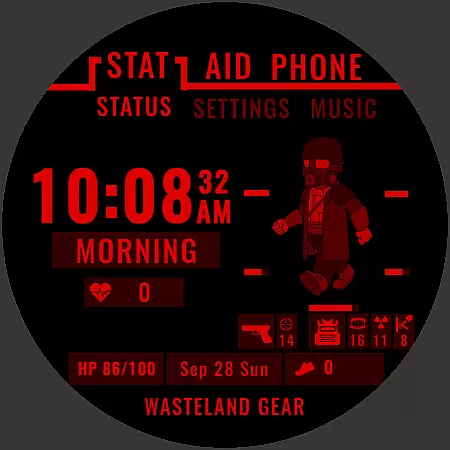 Additional features include prominent time and date displays, a time-of-day indicator for safety planning, always-on mode for constant information visibility, and convenient app shortcuts for quick access to essential functions. These thoughtful design elements make Wasteland Gear not just a stylish accessory but a practical survival companion.