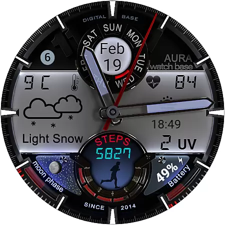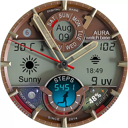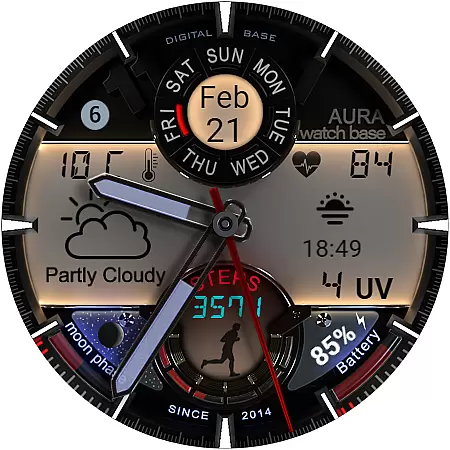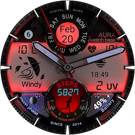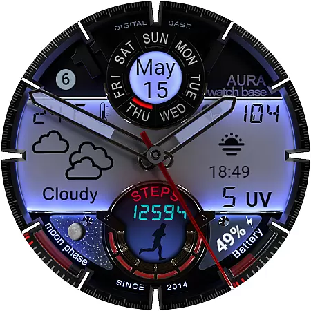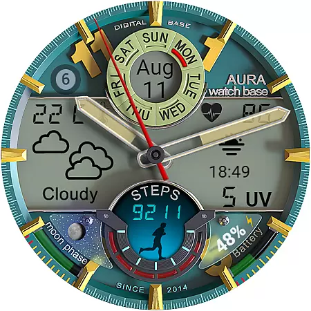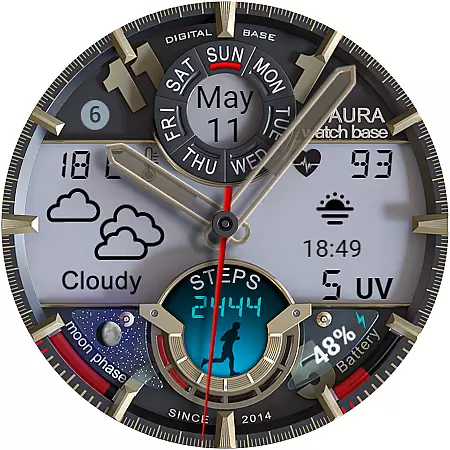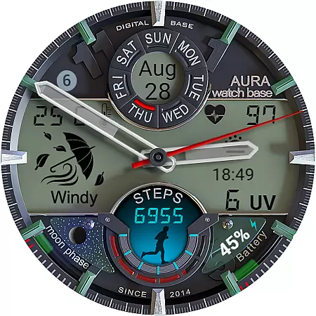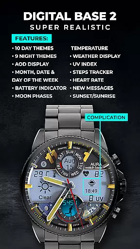 This advanced watch face stands out with its extensive customization options and practical feature set. Users can choose from multiple color themes for both day and night displays, and utilize two editable complications for personalized information display.