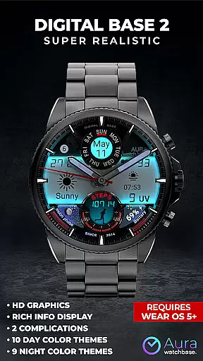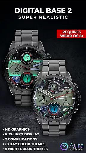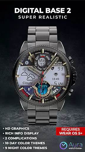 WB DIGITAL BASE 2 Watch Face offers a sophisticated blend of analog aesthetics and digital functionality, designed exclusively for Wear OS 5 and above. This hyper-realistic watch face features an impressive LED-illuminated night mode and comprehensive data display including health metrics, weather information, and customizable complications.