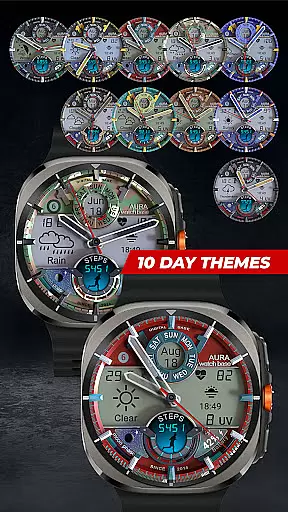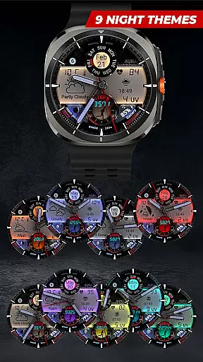 The watch face supports 10 day color themes and 9 night color themes, automatic temperature unit adjustment, and various practical indicators such as battery level, moon phases, and unread messages. Its intuitive design allows users to easily switch between day and night themes and customize their display through simple on-device settings.