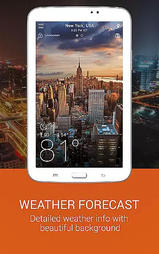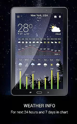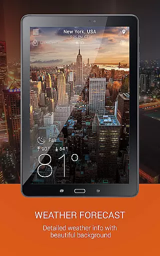 The app offers hourly and daily predictions extending up to 7 days, animated weather conditions with live background images, and a wind guru tool for wind forecasting. Users can switch between Celsius and Fahrenheit, view wind speed and direction in different units, and enjoy a lock screen displaying temperature, rain, clouds, and clock widgets. With ongoing notifications and a weather notification bar, users can stay informed without needing to open the app.