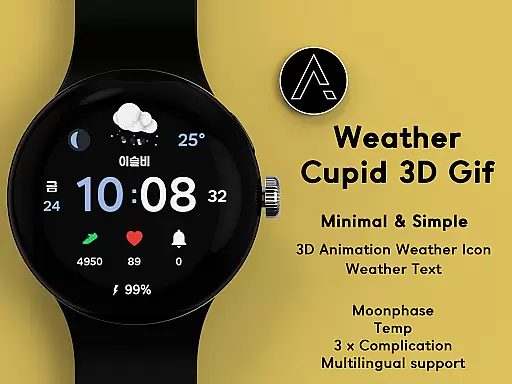 Weather Cupid 3D Gif is a visually appealing Wear OS watch face that combines functionality with aesthetics. This digital watch face features a minimalistic design complemented by lively 3D animated weather icons, making it both practical and engaging. Users can easily check essential information such as temperature, moon phase, and battery percentage while enjoying the intuitive interface.