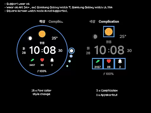 Additional functionalities include multilingual support, moon phase tracking, and battery percentage display. Users can customize their experience through 18 different font color styles and three complication options. The app also integrates seamlessly with Samsung’s weather API, providing dependable weather information. Although square screen modes aren't supported, the overall design ensures optimal performance on compatible devices.