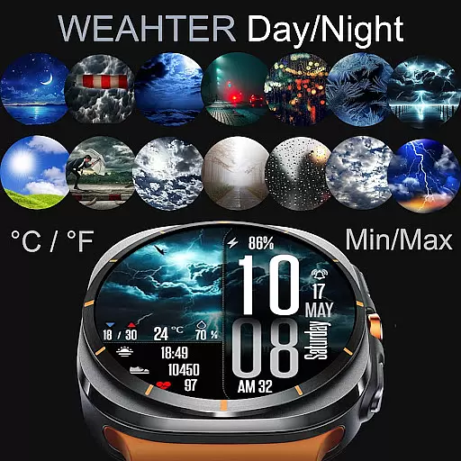 One of the key highlights is its robust weather functionality, offering current weather icons with distinct sets for day and night, temperature readings, and rain probability. Users can also monitor their fitness progress through step counts and heart rate measurements directly from their wrist.