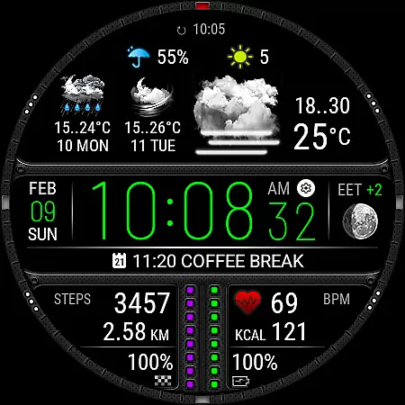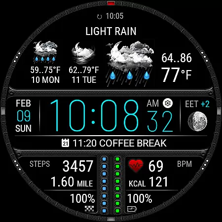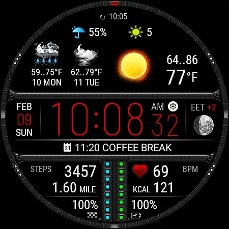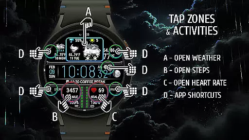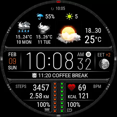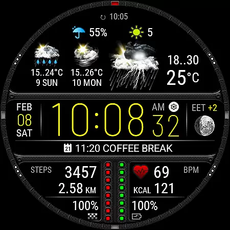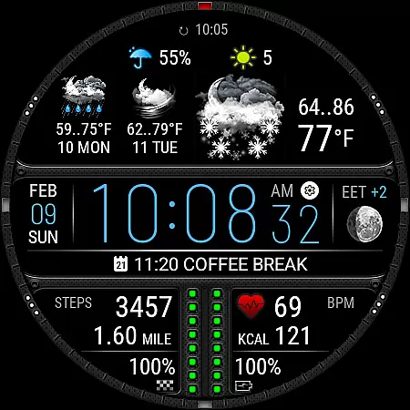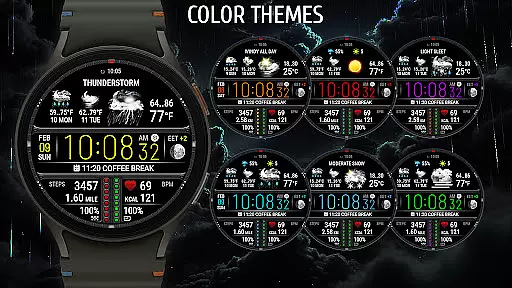 Customization is key with this app, providing eight stunning color themes to match individual styles and moods. Users can further optimize their experience by setting up five quick-launch shortcuts to favorite apps, streamlining daily tasks. Powered by The Weather Channel or system default providers, the app delivers reliable weather data seamlessly integrated into the watch face.