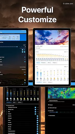 The app's interface is highly customizable, allowing users to tailor their weather dashboard to their specific needs. You can choose which weather elements to display, adjust their priority, and select from various weather icon styles. The app supports both dark and light themes, and its intuitive design makes navigation effortless. Advanced features include 3D globe visualization, Google Maps integration for real-time radar, and comprehensive sun/moon data.