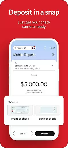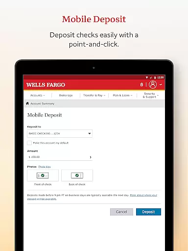 A seamless transaction experience is vital for maintaining user satisfaction in financial applications. Wells Fargo Mobile excels in this area by offering multiple ways to deposit funds, including using the Android camera for check deposits, providing instant visibility of the processing deposit in the user's account.