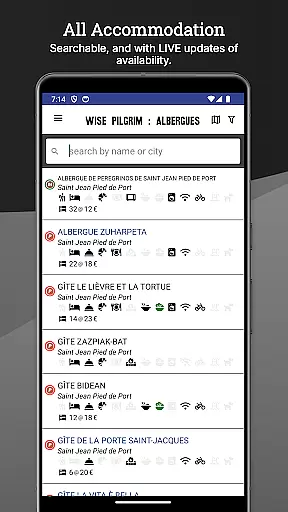One of the standout features of Wise Pilgrim Camino Francés is its regularly updated content and new functionalities. The app provides a full directory of over 900 accommodations, highlighting those that can be booked online. This ensures pilgrims have access to the latest lodging options.