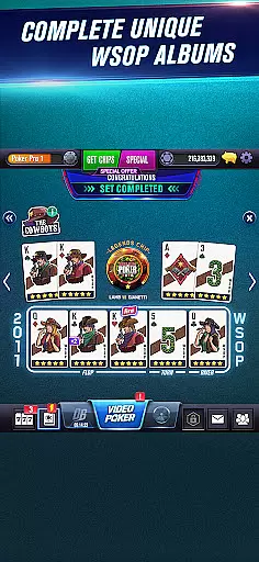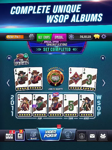 One of the key highlights is the WSOP Album - The History of Poker, where players can unlock exclusive videos featuring iconic poker moments and legendary players. Additionally, The Lightning Show mini-game adds an extra layer of excitement by offering daily rewards. The inclusion of WSOP Poker Academy with commentary from Lon McEachern and Norman Chad provides valuable insights for improving your game.