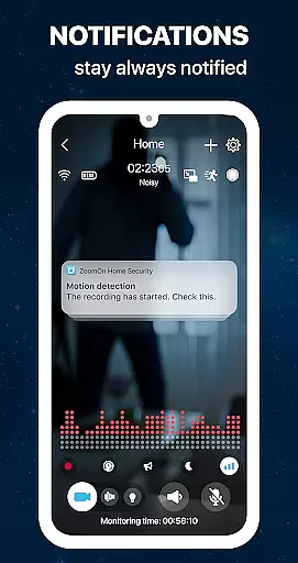 ZoomOn Home Security Camera is a smart home security solution that transforms any two smartphones into a comprehensive monitoring system. The app offers live HD video streaming, unlimited reach across various networks, and advanced features like night vision, motion detection, and two-way audio communication.