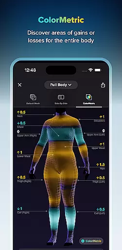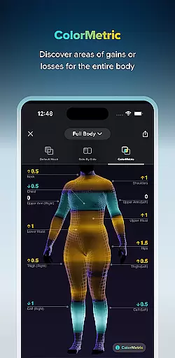 The app's ColorMetric view uses a color gradient system to represent changes in body measurements. This innovative feature highlights areas of growth or reduction with varying color intensities, offering a holistic view of the user's progress. Such visual feedback makes it easier for users to understand how their bodies are changing and respond accordingly.