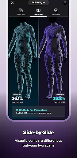 ZOZOFIT offers an impressive array of features that cater to various aspects of fitness tracking. The app's 3D Mesh view provides a full-body, 360-degree visualization with precise measurements for twelve key body areas. Its Side-by-Side comparison tool allows users to visually assess their progress by comparing different scans over time.