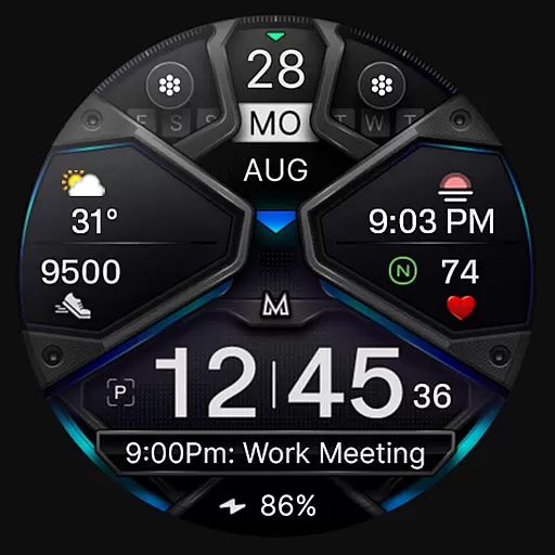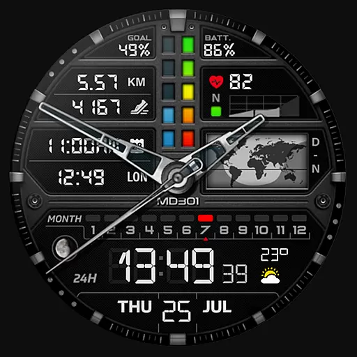 Advanced watch face featuring weather updates, health data and complications.
